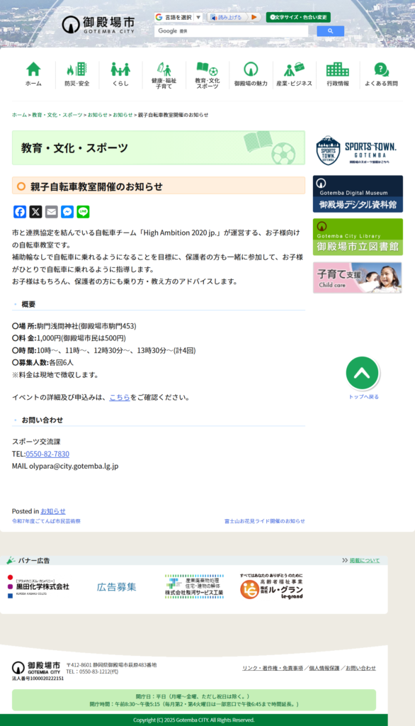 2025年3月29日に御殿場市駒門地区で開催された「親子自転車教室」は無事に終えることができました。